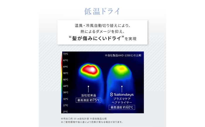 温風・冷風自動切り替えにより、熱によるダメージを抑え、髪が傷みにくいドライを実現。