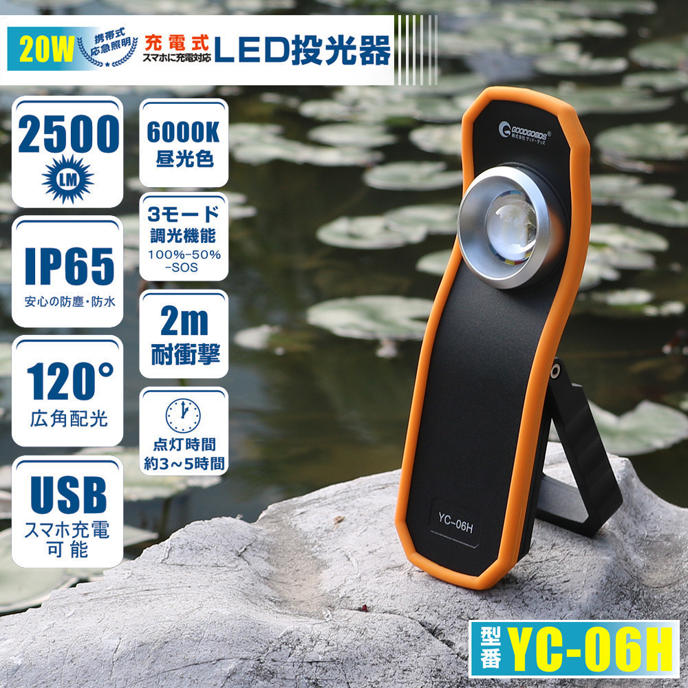充電式LED 20W 耐衝撃 スリム型 回転フック 120°ワイド照射 腰袋にも入る スマホ用三脚利用可 YC-06H