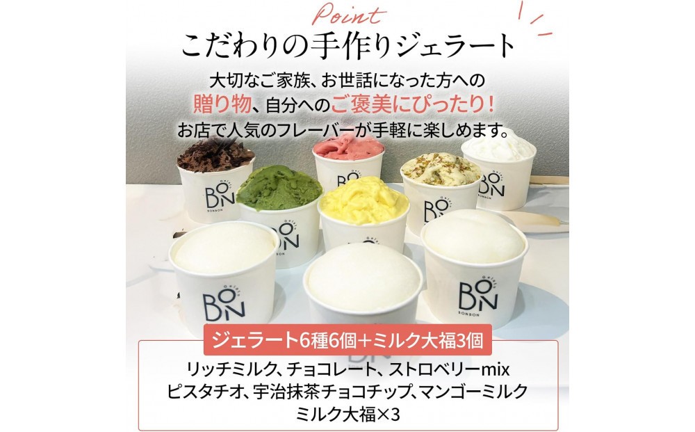 | 容量 | ジェラート 7種9個 ミルク大福入り リッチミルク ×1 チョコレート ×1 ストロベリーmix ×1 ピスタチオ ×1 宇治抹茶チョコチップ ×1 マンゴーミルク ×1 ミルク大福×3 |