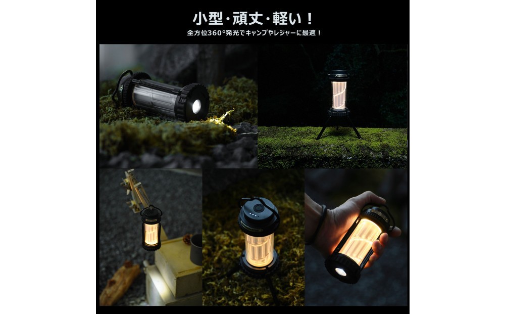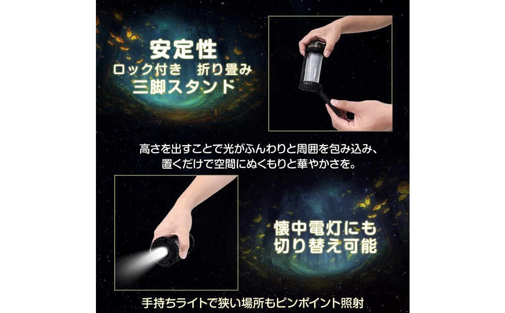 三脚を広げてスタンドライトに、折り畳んでランタンに、先端は懐中電灯にも