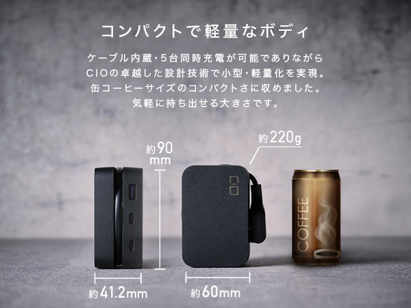 最大5台の同時充電が可能でありながら、CIOの卓越した設計技術で小型・軽量を実現。