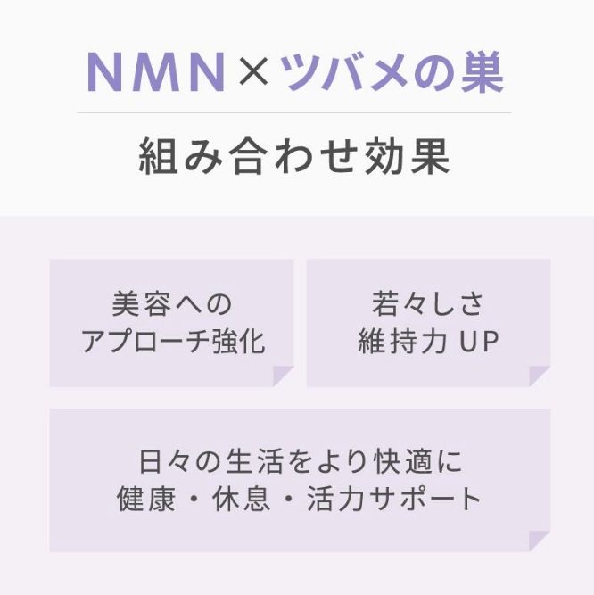 NMNは肌コラーゲン生成の促進や肌ダメージの修復促進等の美容効果と、細胞活性化による若さの維持や睡眠の質向上といった健康促進効果が期待できる成分です。