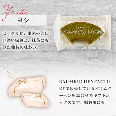 | 消費期限 | ■バウムクーヘンギフトボックスプレーン・ショコラ・季節限定・和三盆・ヨシの5種類のカットバウムを詰め合わせたギフトボックス。いろんな味わいを楽しむことができます。個包装でシェアしやすいので手土産やギフトに最適。おしゃれなパッケージとギフトボックスは、特に女性の人気を集めています。 ・プレーン 米粉と酒粕を使用したプレーンは、柔らかくて口溶けの良いふわふわ食感と優しい味わいが特徴。お子さんから年配の方まで、誰からも愛されるバウムです。 ・ショコラ カカオ分70%のチョコレートをたっぷり使用した贅沢なバウム。食べた瞬間、芳醇な香りと濃厚な味わいが口の中でふわっと広がり、その余韻を楽しむことができます。 ・季節限定(いちご) 写真はいちごバウム。季節に合わせてかぼちゃや紅茶などのバウムもつくっています。その時期にしか味わえない旬の美味しさをお届けします。 ・和三盆 米粉と酒粕を原料に使用した生地に、優しい甘さの和三盆糖を加えて焼き上げました。もっちりふわふわ食感を楽しめます。 ・ヨシ 天野川セイタカヨシバウダーを使用した抹茶のような風味のバウムは、お子さんも食べやすい、やさしい甘みのふわふわ食感。カフェインゼロで鉄分・葉酸・ビタミンC をたっぷり含んだ健康で美味しい牧野イチオシの特産品です。 ■賞味期限:製造日から30日 |