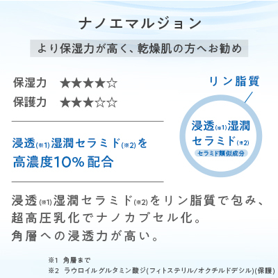 ナノエマルジョンプラスに比べ、より保湿力が高く、乾燥肌の方へお勧めです。
