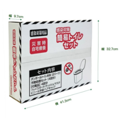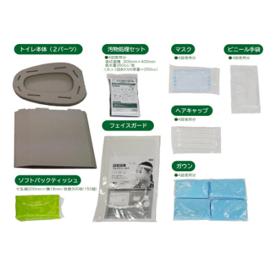 ・トイレ本体(2パーツ)・処理セット(4回分)・ティッシュソフトパック(150W)・サージカルマスク(4枚)・フェイスガード(1個)・ガウン(4個)・ビニール手袋(4セット)