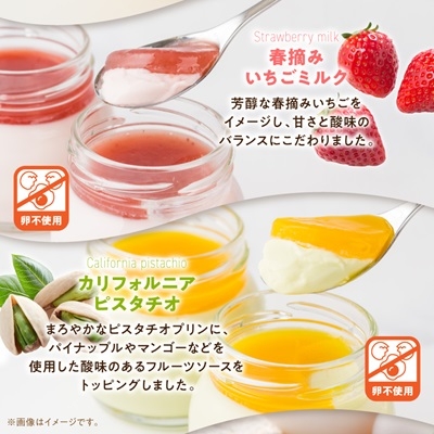 芳醇な春摘みいちごをイメージし、甘さと酸味のバランスにこだわりました。プリンはやさしい甘さのいちごミルク味となっており、トッピングのいちごソースは甘酸っぱく、良いアクセントになっています。お子様にも人気の高い商品。卵不使用のプリンです。