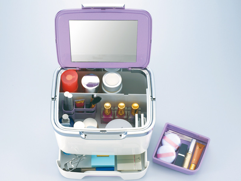 スキンケア商品からメイク小物までのコスメ用品をすっきり収納できる、うれしいコスメボックス。ワイドな鏡付きで、場所を選ばずお手入れできて便利です。