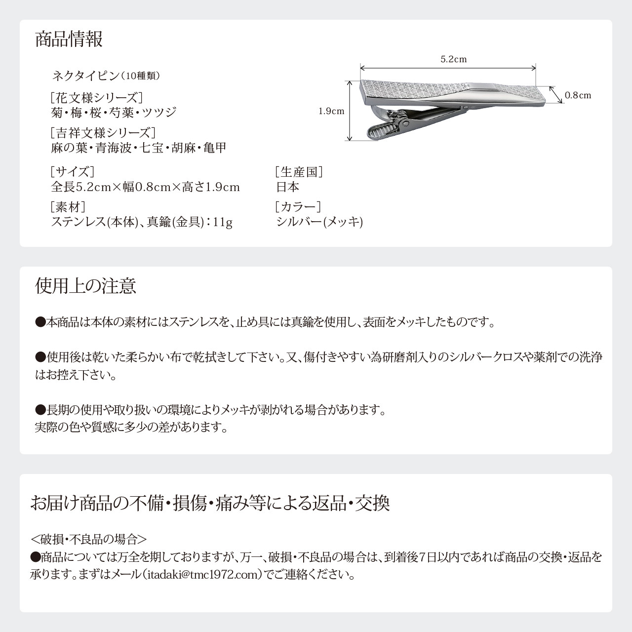 ビジネスシーンはもちろんパーティーやフォーマルシーンなど、様々なシーンで幅広くご使用いただけ、ネクタイピンをお持ちでない方にもファッション性と機能性を兼ね備えたアクセサリーを持っておくと安心なアイテムとしてお薦めいたします。