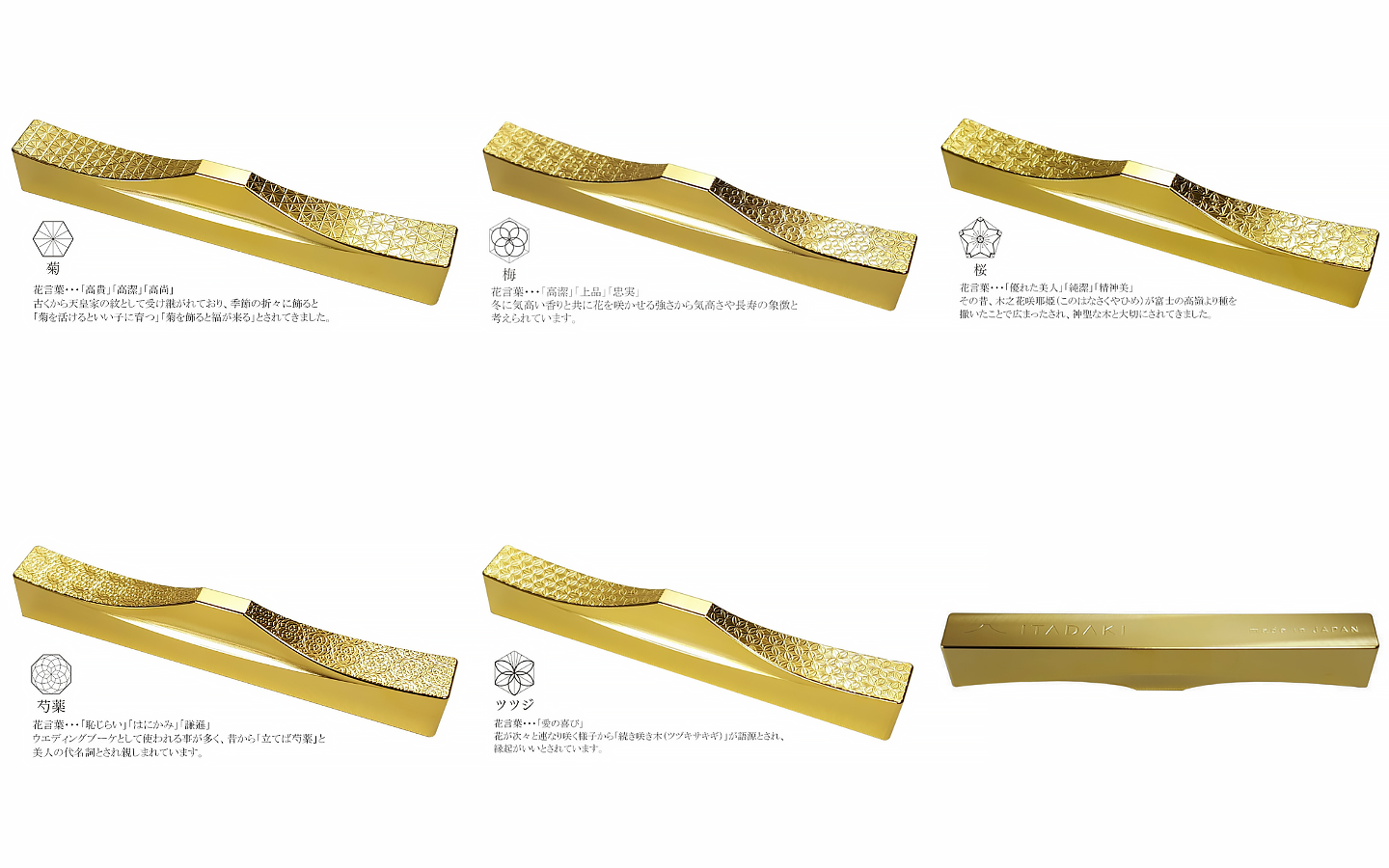 | 容量 | いずれか1つをお選びください。 1.花文様(菊・梅・桜・芍薬・ツツジ)5個セット 金メッキ 2.花文様(菊・梅・桜・芍薬・ツツジ)5個セット 金箔 3.吉祥文様(麻の葉・青海波・七宝・胡麻・亀甲)5個セット 金メッキ 4.吉祥文様(麻の葉・青海波・七宝・胡麻・亀甲)5個セット 金箔 |