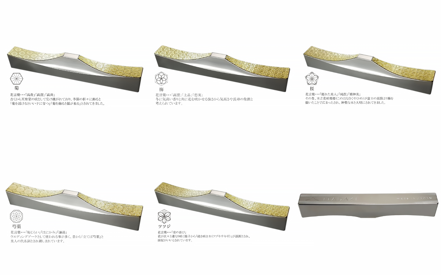 ステンレス製のシルバー・金メッキを施したゴールド・文様部に金箔をあしらったツートーンのカラー展開。