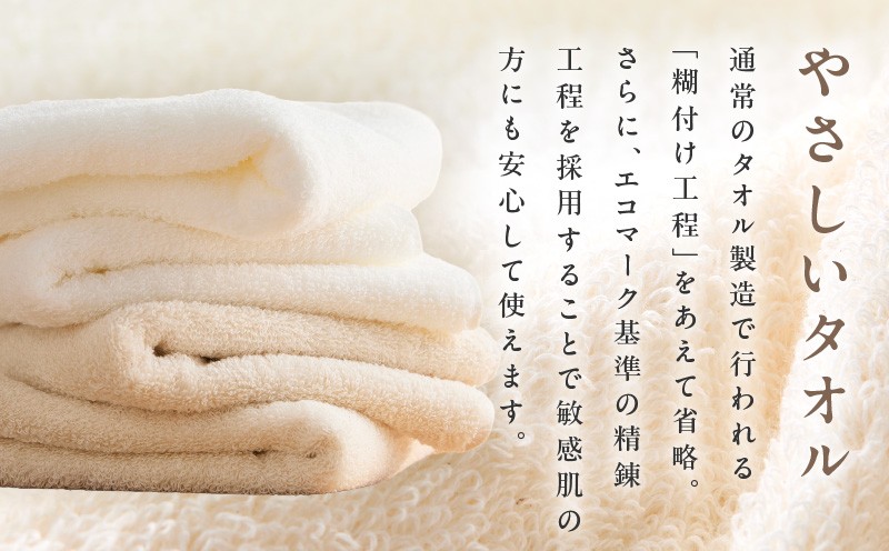製造工程でタオルを織り上げた後にさらし(精錬漂白)を行う「後晒し(あとざらし)製法」により、一般のタオルよりも繊維の吸水性や通気性が優れ、肌ざわりが良くなります。