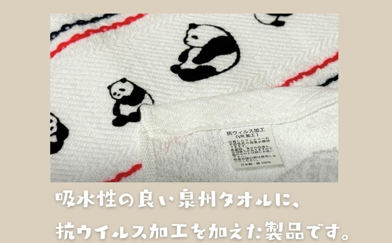 後晒工法で仕上げた吸水性の良い泉州タオルに抗ウィルス加工を加えました。畦柄に織り上げた泉州タオルのボーダー部分に可愛らしいアニマル柄をプリントしています。