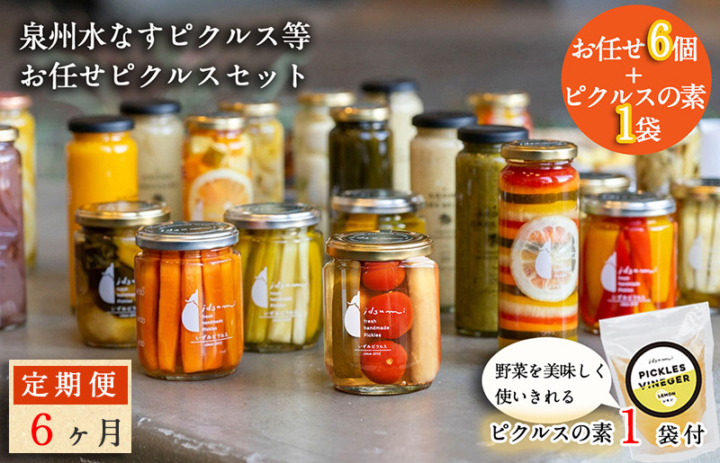 泉州特産の「水なすピクルス」と、いずみピクルスの人気ピクルスからの計6個セット、ピクルスの素1個を、毎月1回、計6回お届けいたします。