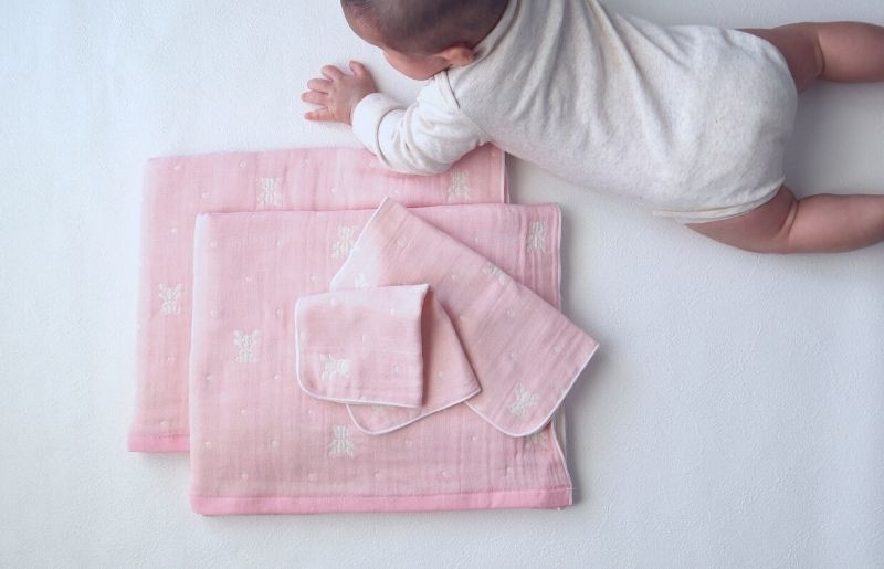 全行程、泉佐野市で製造しております。4重ガーゼのミニバスタオル、3重ガーゼのハンカチを各2枚ずつセットにし、ベビーからキッズまで長く使えるアイテムを揃えたセットです。コットン100%で吸水性・速乾性に優れた柔らかいガーゼ生地は、汗っかきな赤ちゃんの肌に優しく包み込みます。出産前や入園前の準備に重宝する何枚あっても便利なピンクのセットです。