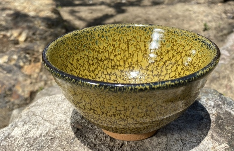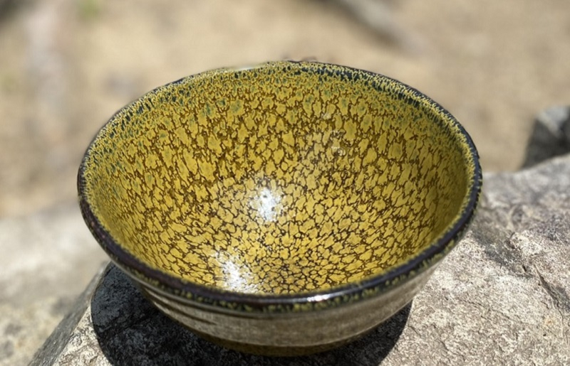 油滴天目茶碗は曜変天目茶碗と同じく、中国・南宋時代(12~13世紀)の建窯(福建省)で作られたとされています。窯内で生じた斑紋が宇宙のようでもあり、玉虫色に光る油の斑紋のようでもあることからその名が名付けられ、内外全面に油滴と呼ばれる粒状の斑文が散らばり、貴金属のような輝きを見せるのも油滴天目の特性の一つです。油滴天目の特性上、一度に多くの器を手がけにくく、各々で見られる模様に差異があり、そういった希少性の高さやそれぞれに見られる模様が異なる点、日本文化のわびさび、幽玄に通じることから、歴史上では献上品として大変重宝されてきました。一般的には黒や青で制作されているものがほとんどですが、泉佐野市の陶芸家 番匠谷 武は黒油滴天目の基礎釉で焼成レシピを自在に操り、「黄華窯変油滴天目茶碗」を完成させました。番匠谷 武以外には作れない、貴重な油滴天目茶碗です。