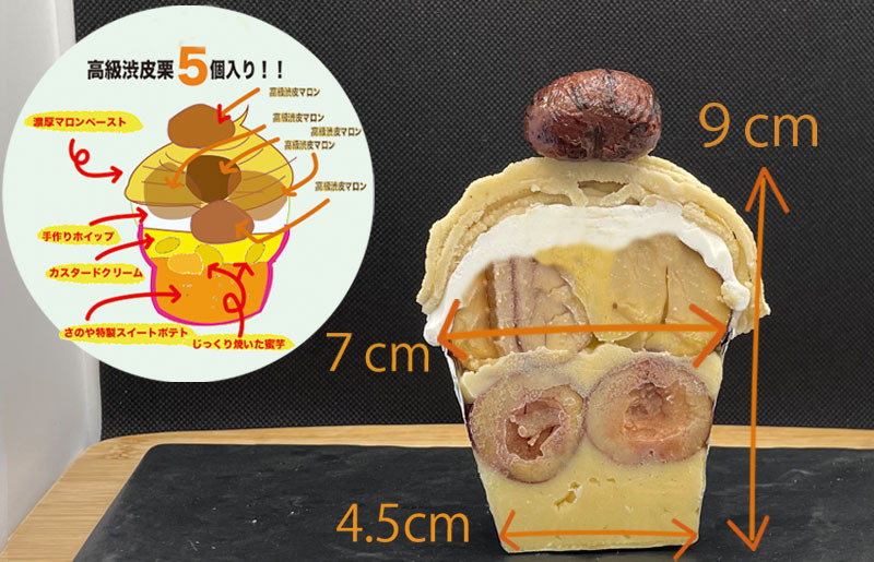 高級渋皮栗が5つと、さのやの大人気濃厚スイートポテトが入ったモンブラン!栗ペーストとまろやかに仕上げた生クリーム・カスタード!そしてこれでもか!と入った栗と蜜が入ったさつまいも、特製スイートポテトが口の中で広がって、幸せ溢れる史上最強の美味しさ!どこをすくっても栗が出てくる、栗、栗、栗!セレブ気分が味わえます。ご家族や友人等とシェアして食べてください♪