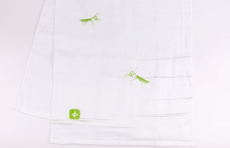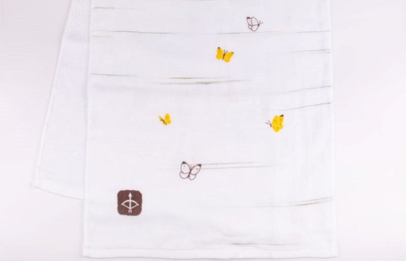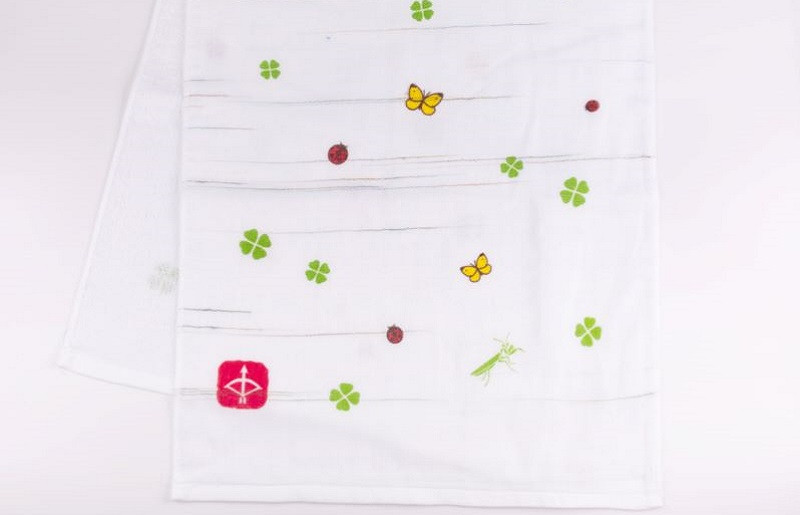 片面ガーゼ、片面パイルのフェイスタオルです。ガーゼ面にプリントを施しています。泉州タオルの特徴である吸水性はもちろん、ガーゼ面・パイル面の2層仕上げで乾きも早いです。原料の綿糸は国内の紡績工場で作られたものを100%使用するJAPAN madeです。小さな町工場で作っています。