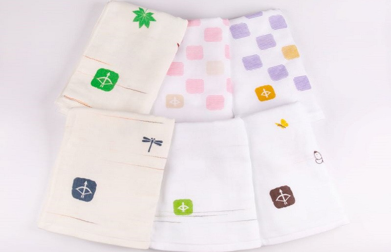 片面ガーゼ、片面パイルのフェイスタオルです。ガーゼ面にプリントを施しています。泉州タオルの特徴である吸水性はもちろん、ガーゼ面・パイル面の2層仕上げで乾きも早いです。原料の綿糸は国内の紡績工場で作られたものを100%使用するJAPAN madeです。小さな町工場で作っています。