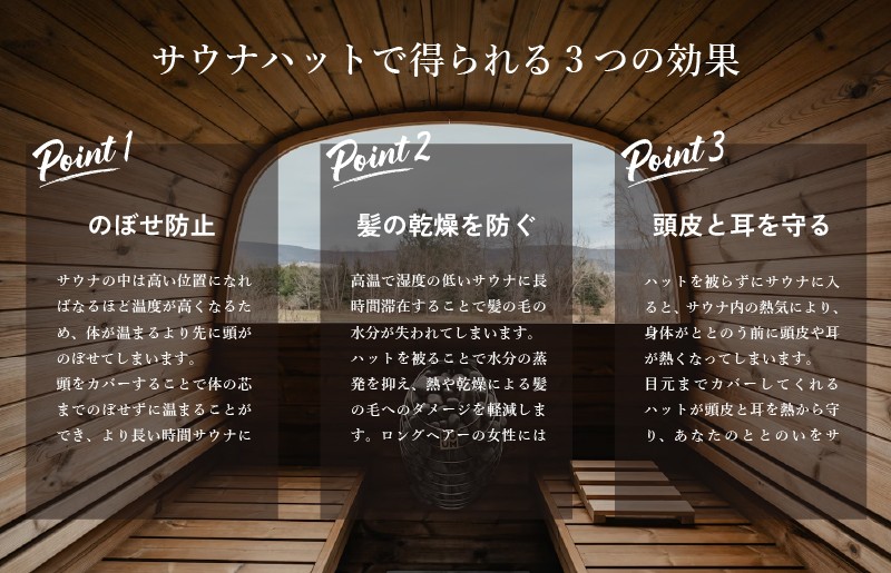 泉州タオル生地で作った綿100%のサウナハットは綿の優しい肌ざわりで吸水力はバツグンです。サウナの熱い蒸気による「のぼせ」や「髪の乾燥」を防いでくれ、快適なサウナライフを楽しめます。