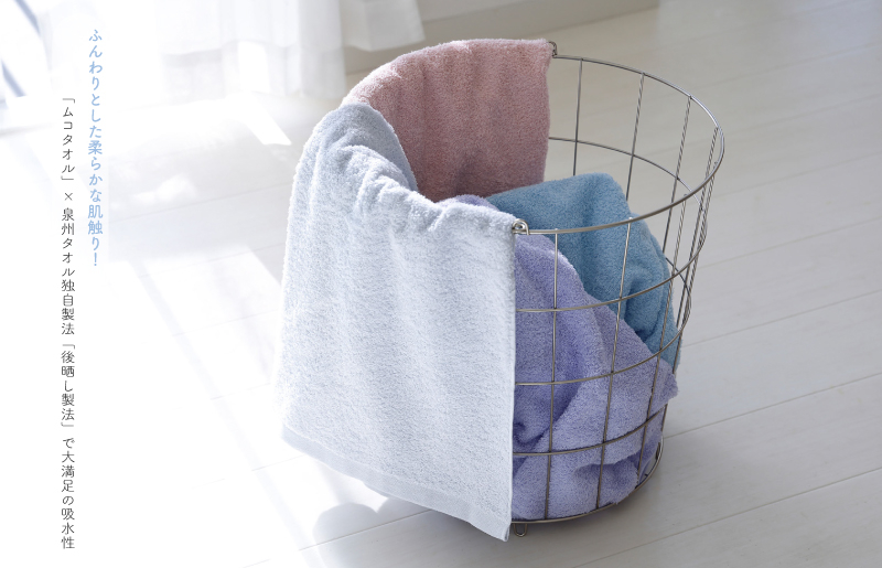 泉州タオル独自製法「後晒し製法」×「ムコタオル」により使い始めから清潔で、吸水性抜群です!