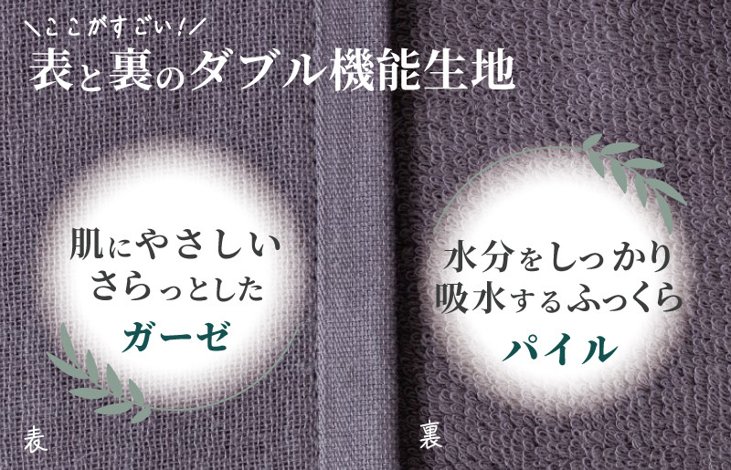 表は肌にやさしいさらっとしたガーゼ、裏は水分をしっかり吸水するふっくらパイルのタオルです。薄くつくられているので乾きやすく、コンパクトに収納できます。さらにループ付なのでどんなシーンでも大活躍。ベーシックかつシンプルな色合いで、暮らしをやさしく彩ります。
