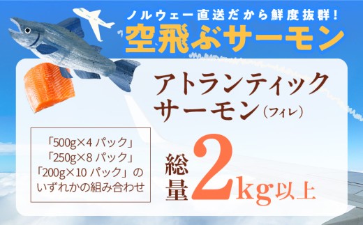 容量 | ・アトランティックサーモン 総量2kg以上 ※「500g×4パック」「250g×8パック」「200g×10パック」のいずれかの組み合わせでお届けします。 形状:フィレ ※画像はイメージです。 |