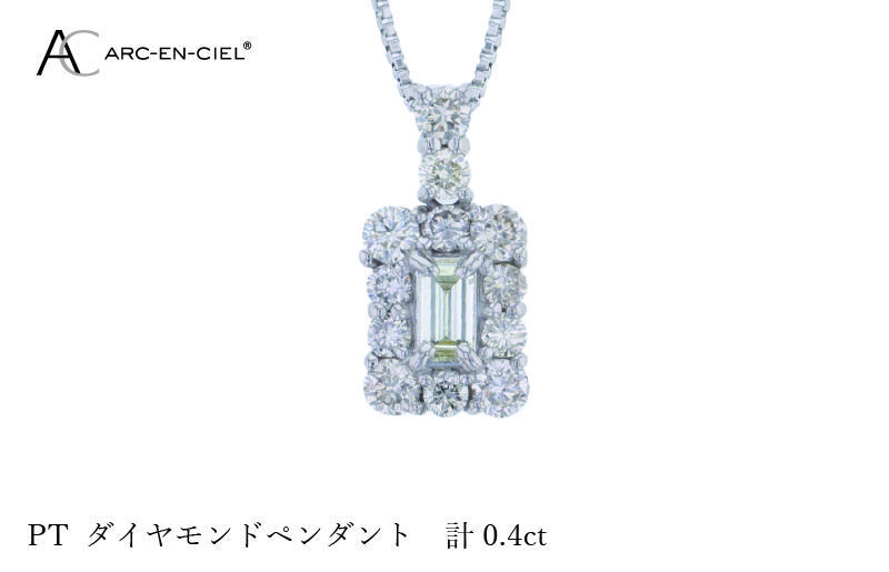 3つのパーツを縦長に連ねた艶やかなPTペンダント。 バゲットカット&ラウンドブリリアントカット2種の異なるカットを使用。フォーマルにもカジュアルにもお使いいただけるジュエリーです。 『ARC-EN-CIEL (アルカンシェル)』は、虹を見たときのような嬉しく幸せな気持ちが日々感じられるようジュエリーに想いをこめたブランドです。 天然ダイヤモンド、主要な加工地:泉佐野市 【地場産品に該当する理由】 当該返礼品は、区域内の加工場において、オリジナルブランド「アルカンシェル」のリューター研磨仕上げ、バフ研磨仕上げと刻印等、製造・加工の工程の主要な部分を行っています。(告示第5条第3号に該当)