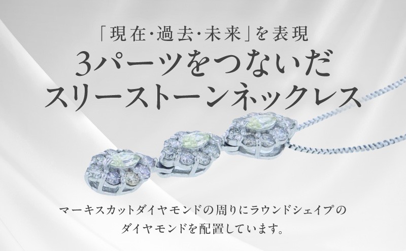 3パーツをつないだスリーストーンネックレスは「現在・過去・未来」を表現しています。『あなたの過去も現在も未来も全てを愛しています』という素敵な意味合い。マーキスカットダイヤモンドの周りにラウンドシェイプのダイヤモンドを配置し、マーキスカットダイヤモンドの持つクラシカルな雰囲気と甘さを抑えた大人可愛いをアピールしたデザインです。