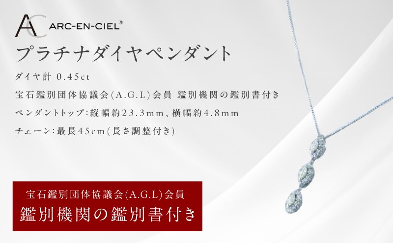 3つのパーツを縦長に連ねた艶やかなPTペンダント。 バゲットカット&ラウンドブリリアントカット2種の異なるカットを使用。フォーマルにもカジュアルにもお使いいただけるジュエリーです。 『ARC-EN-CIEL (アルカンシェル)』は、虹を見たときのような嬉しく幸せな気持ちが日々感じられるようジュエリーに想いをこめたブランドです。 天然ダイヤモンド、主要な加工地:泉佐野市 【地場産品に該当する理由】 当該返礼品は、区域内の加工場において、オリジナルブランド「アルカンシェル」のリューター研磨仕上げ、バフ研磨仕上げと刻印等、製造・加工の工程の主要な部分を行っています。(告示第5条第3号に該当)