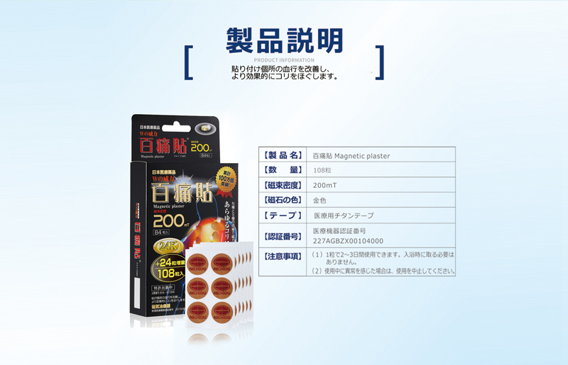 チタンテープと24Kメッキ加工をした200ミリテスラの磁石が、貼り付けた部位のコリを緩和し、血行を改善する効果が期待されています。金属アレルギーの方やお肌が弱い方でもご使用いただけます。