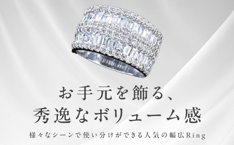 バゲットカット&ラウンドブリリアントカット 2種の異なるカットを使用。様々なシーンで使い分けができる人気の幅広Ring。秀逸なボリューム感をお楽しみ下さい。