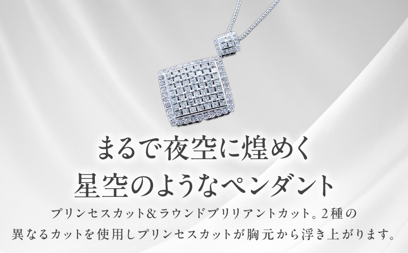 プリンセスカット&ラウンドブリリアントカット 2種の異なるカットを使用。プリンセスカットが胸元から浮き上がり、まるで夜空に煌めく星空のようなペンダントです。