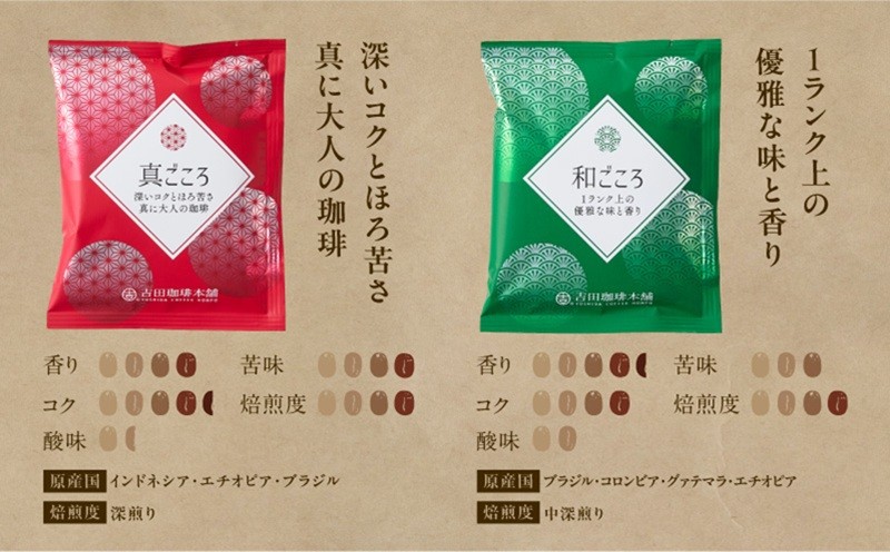 | 容量 | ▼1回のお届け内容 真ごころブレンド(10g×5袋) 和ごころブレンド(10g×5袋) 喜ごころブレンド(10g×5袋) 笑ごころブレンド(8g×5袋) バリ・アラビカ神山フルシティ(10g×5袋) ※画像はイメージです。 |