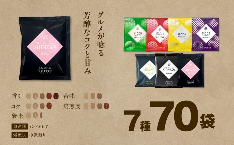 厳選した生豆を自社で焙煎からドリップバック加工まで一貫製造。鮮度と香味にこだわった小ロット生産で新鮮なコーヒーを工場直送、真ごころ込めてお届け致します。こだわりのブレンド4種類に、スペシャルティーなバリ・アラビカ神山3種類が入った!