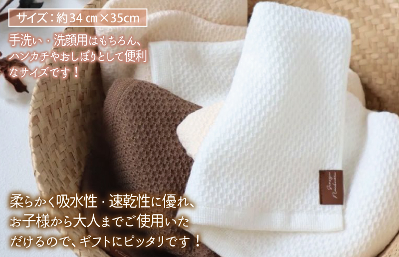 | 容量 | ソフトハニカム ウォッシュタオル 3枚(ベージュ・ホワイト・ブラウン各1枚) サイズ:約34×35cm ※画像はイメージです。 |