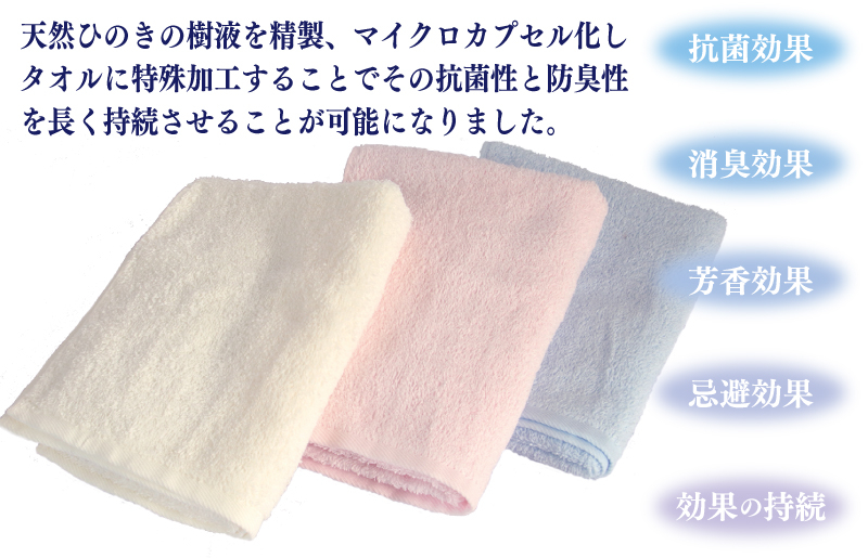 天然ひのきの樹液を精製、マイクロカプセル化しタオルに特殊加工することで、その抗菌性と防臭性を長く持続させることが可能になりました。自然の成分を利用しておりますので、安心してご使用いただけます。
