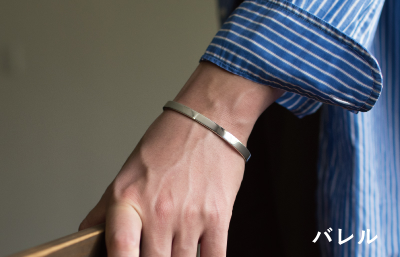 メンズ雑貨ブランドTAVARATのシルバー950製バングル。角を落とし、丁寧に研磨した洗練されたデザイン。バレル研磨は研磨石で表面を磨き、小傷の入ったアンティークな表情に。