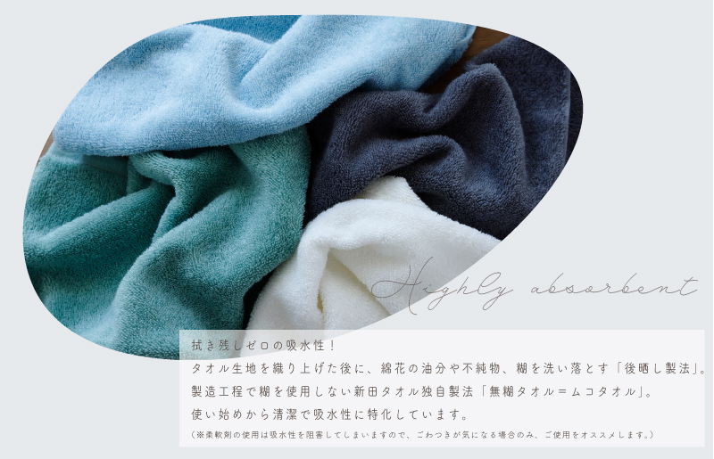 製造工程で糊を使用しない独自製法「無糊タオル=ムコタオル」。