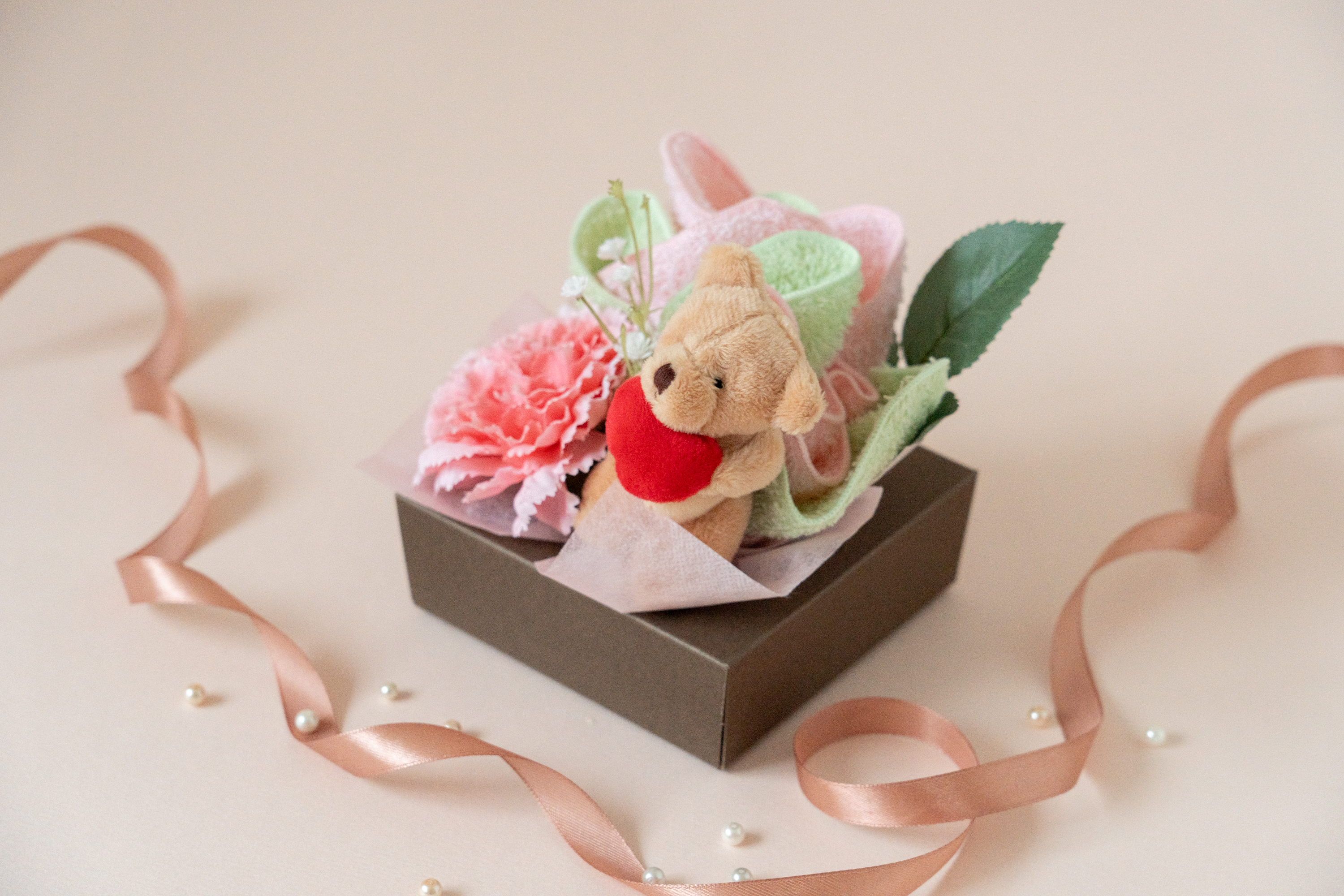 肌触りの良い泉州タオルを使用し、カーネーションとカスミソウの造花を組み合わせ華やかな仕上がりとなっております。