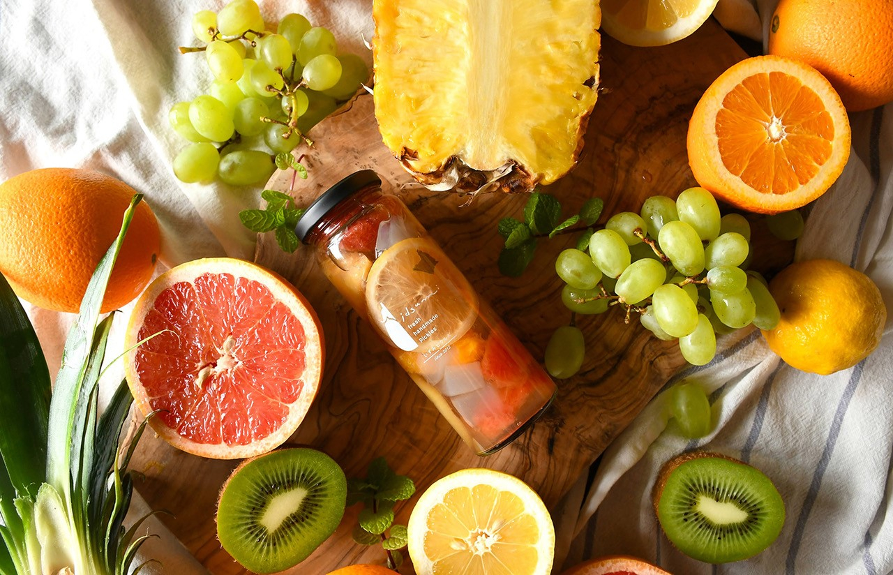 グレープフルーツ(南アフリカ産)、オレンジ(オーストラリア産)、パイナップル(フィリピン産)、ぶどう(アメリカ産)、キウイ(ニュージーランド産)、レモン(アメリカ産)、ナタデココ