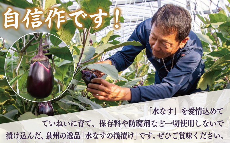 泉佐野市がある大阪府南部の泉州地域の土壌で作られた「水なす」は、水分を多く含み、皮が柔らかで、かみしめるほどにほのかな甘みのある風味、そして綺麗な紫の濃淡のある色艶が特徴で、この「水なす」を使った「水なすの浅漬け」は絶品で泉州地域の特産品となっています。