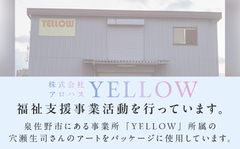 泉佐野市に拠点がある事業所「YELLOW」所属、穴瀬生司さんのアートを使用し、パッケージにデザインを施しています。また梱包出荷作業を障がい者の方が作業し、皆様の元へお届けします。