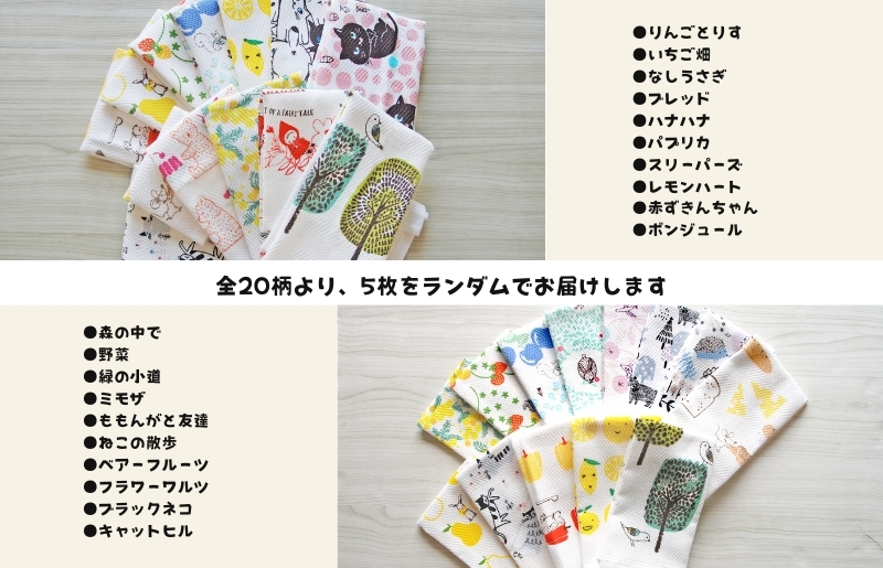 | 容量 | ふきぴかキッチンタオル×5枚 サイズ :34×38cm デザイン:全20柄より5枚をおまかせ ※画像はイメージです。 |
