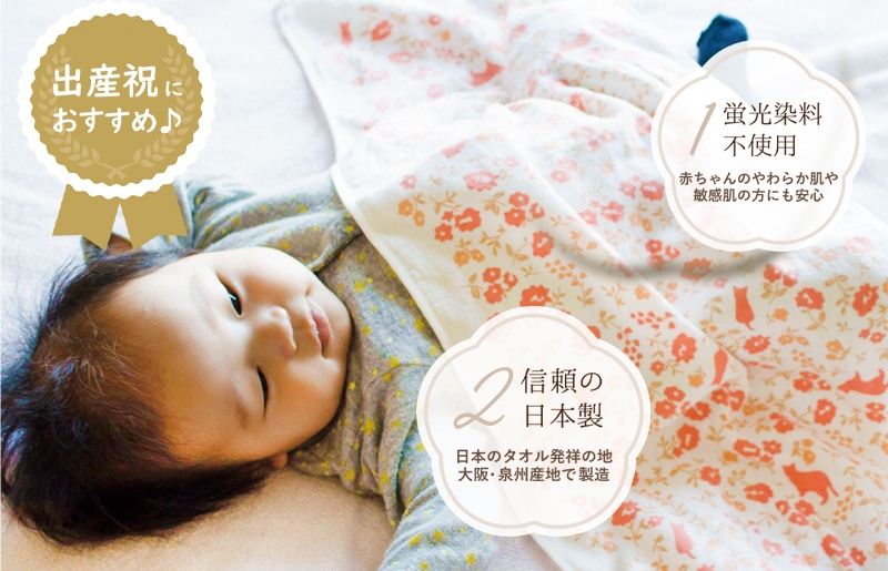 弊社所属のタオルソムリエと芸術大学出身のデザイナーがオリジナルで作成。 タオルの産地泉州で生産された、安心の日本製ガーゼタオルです。 赤ちゃんやお肌の敏感な方にも、普通肌の方にもおすすめしたい優しい風合いが特徴です。 販売枚数は社内1,2を争う人気商品です。 原材料:綿100%、製造:泉佐野市 ※この返礼品を選ぶと使途は自動的に【泉州タオルを世界へ!事業所集約プロジェクト(前編)(又は市長におまかせ )】となります。