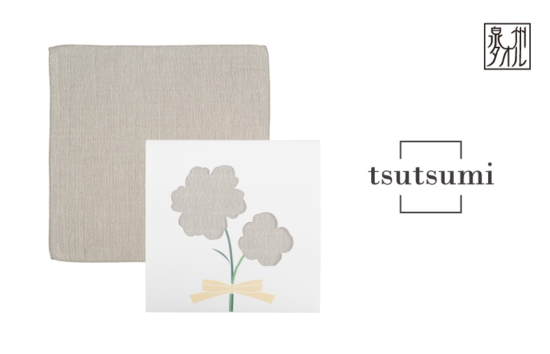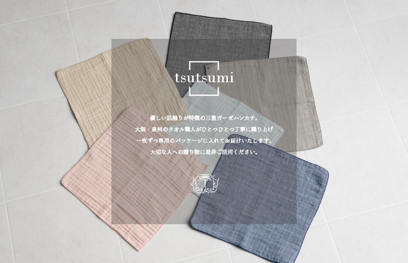 そのまま渡せるオリジナル個包装ラッピングに包まれた三重ガーゼハンカチ"tsutsumi"。