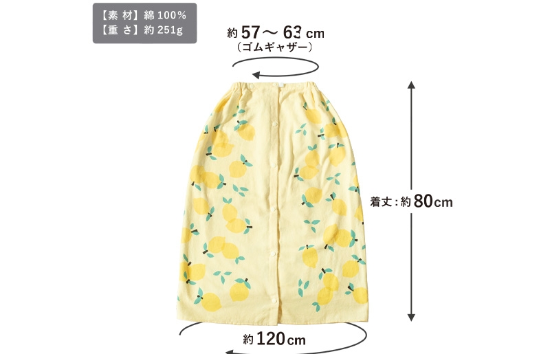 | 容量 | ラップタオル1枚、柄:レモン(ミントグリーン) サイズ:ギャザー部分57~63cm、着丈約80cm、幅約120cm 重さ:約 251g ※画像はイメージです。 |