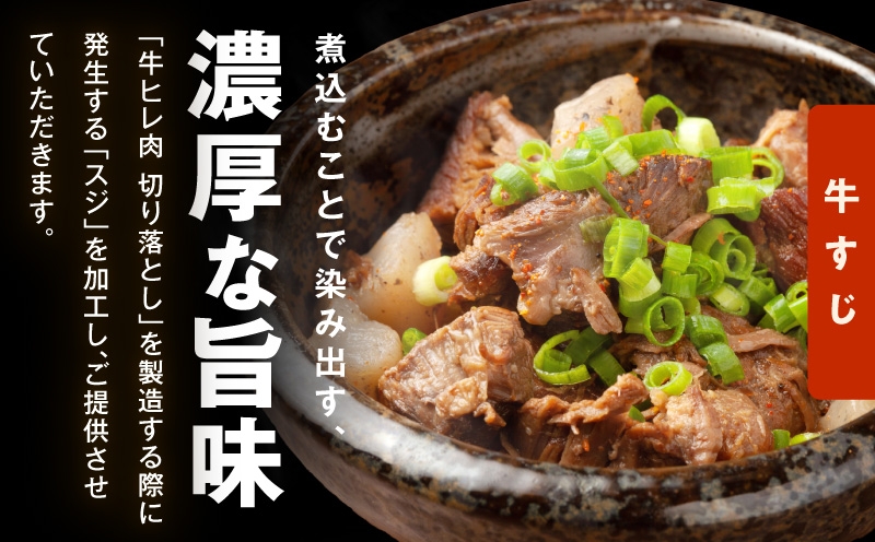 「牛ヒレ肉 切り落とし」を製造する際に発生する「スジ」を加工し、返礼品としてご提供させていただきます。牛すじの肉片が細かかったり、薄いものもございます。