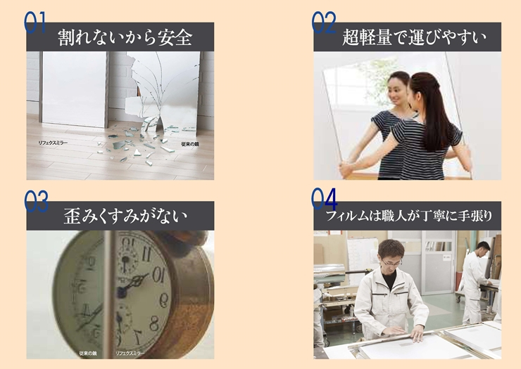 国内工場で製造・販売を開始して50年の実績をもつ「軽い!」「割れない!」「映りがキレイ!」リフェクスミラー。