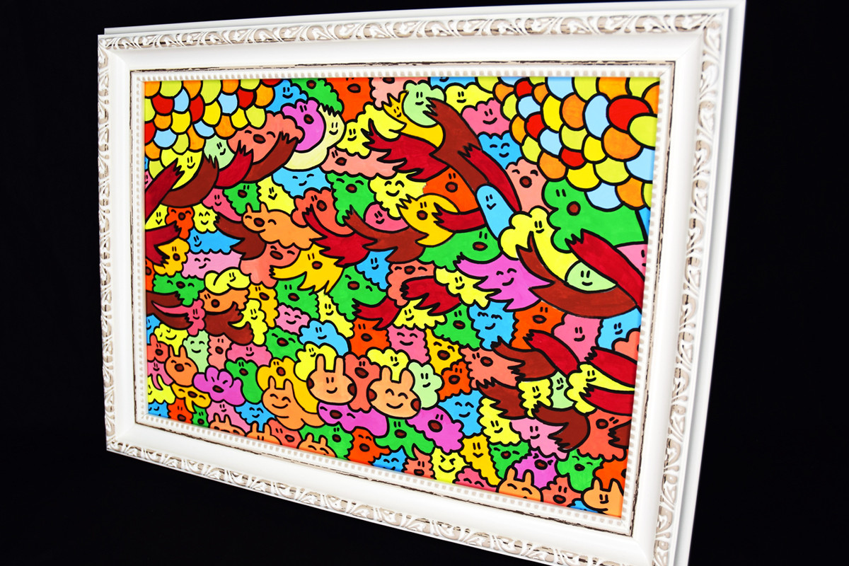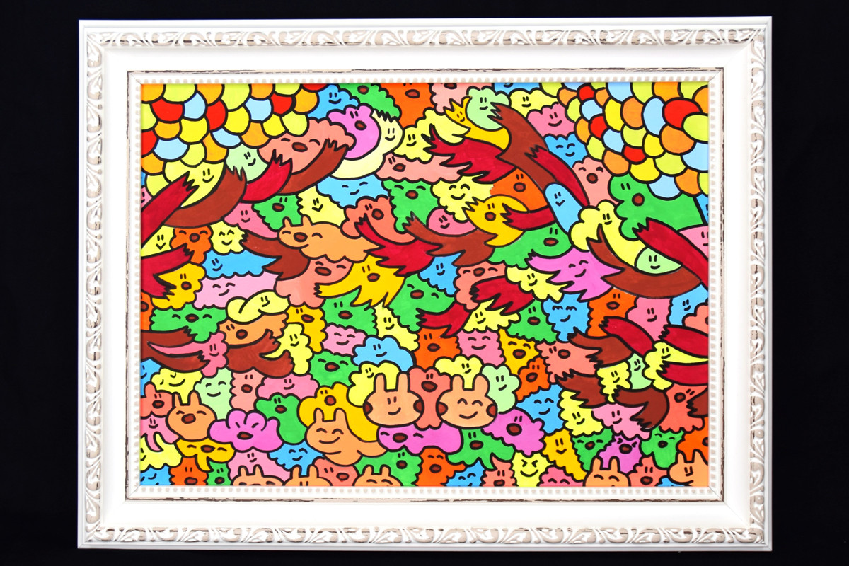 チョイス限定 しょうがいしゃ作家発信!【しょうがいしゃアート】野本晃弘 作「どうぶつの木を公園にたのしくように心こめてピクニック」|絵画 アクリル画 原画 額装 [0845]