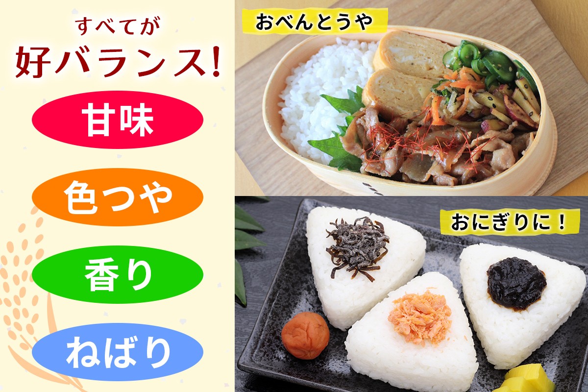 甘みが強く、色つや、香り、ねばり、バランスのとれた美しい白米